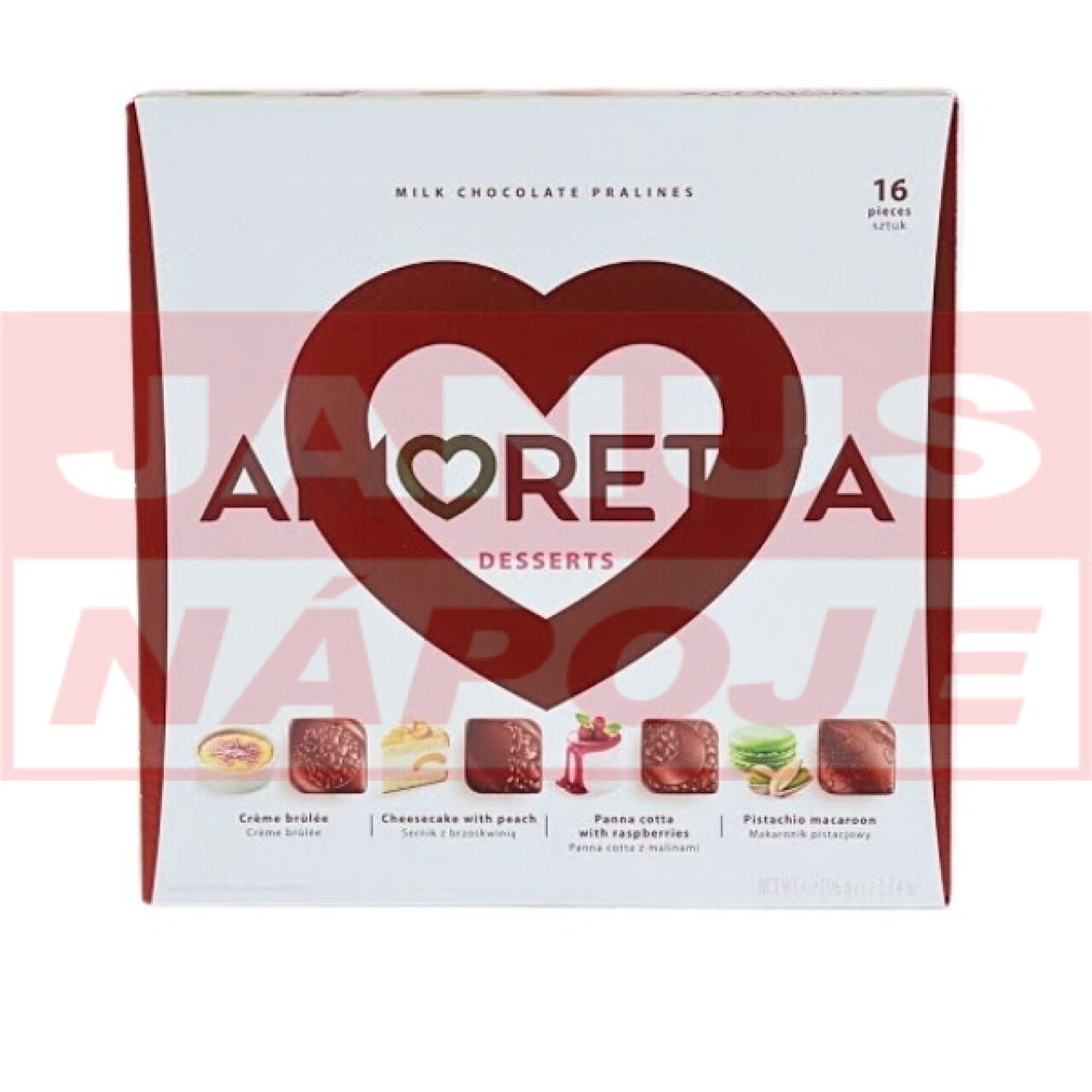 Pralinky v mliečnej čokoláde v štyroch dezertných príchutiach: creme brulle, pistáciové makrónky, panna cotta s malinami, cheesecake s broskyňami.