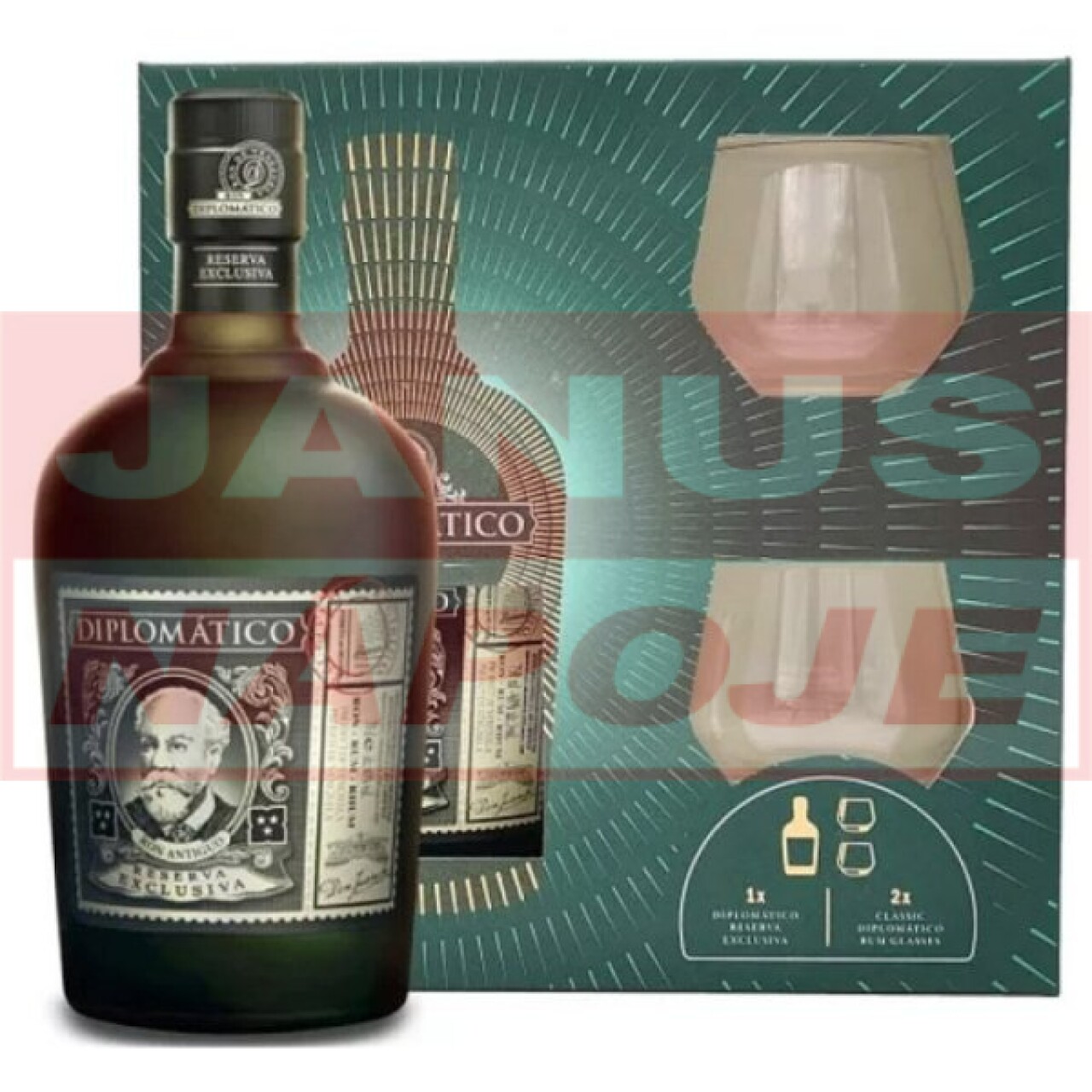 Diplomático Reserva Exclusiva je znamenitý 12 ročný rum tmavej, medenej farby, ktorého chuť je plná vanilky, zrelého ovocia, maslových keksíkov, a tónov karamelu, tabaku a orieškov. Vychutnajte si ho v štýlovom darčekovom balení s dvomi značkovými pohármi.