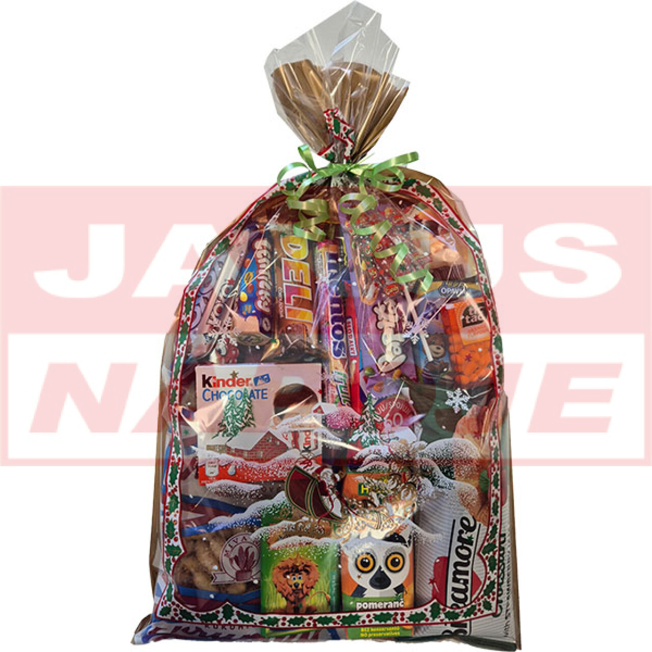 Sáčok mikulášsky, Hello Mini 0,25l, Croissant 55g, Alaska trubičky 18g, Lízanka 8g, Malinky 80g, Gerard Wafel 25g, Deli 35g, Koko 35g, Papita 33g, Smile pancake 50g, Chrumky Miva 60g, Gerard Mini cake 27,3g, Horalka 50g, Kinder čokoládky 50g, Banán v čokoláde 45g, Mentos 38g, Twix 50g, Tic-tac orange 18g, Lentilky 28g, Bebe-brumik 30g, Čokoládka Kráľovstvo zvierat 15g