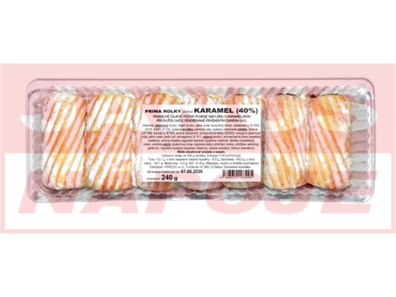 | Zloženie | pšeničná múka, náplň (cukor, pitná voda, kukuričný škrob, stabilizátory (E1442, E415, E401, E170), sušená srvátka, palmový olej, sušené odstredené mlieko, farbivá (150b, karotény, E163), aróma (karamel), konzervačná látka (E202), margarín (palmový olej, pitná voda, jedlá soľ, emulgátor kyslosti (kyselina mliečna), farbivo (karoteny)), cukor, sušené vajcia, glukózový sirup, kypriace látky (uhličitan sodný, uhličitan amónny), jedlá soľ, regulátor kyslosti (kyseina mliečna), aróma (vanilka), farbivo (karotény) |